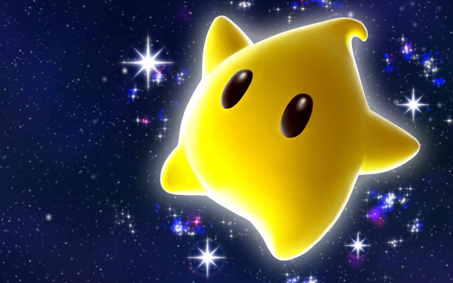 Description: A yellow star with eyes and nose on a blue background with stars and a black background with white stars.