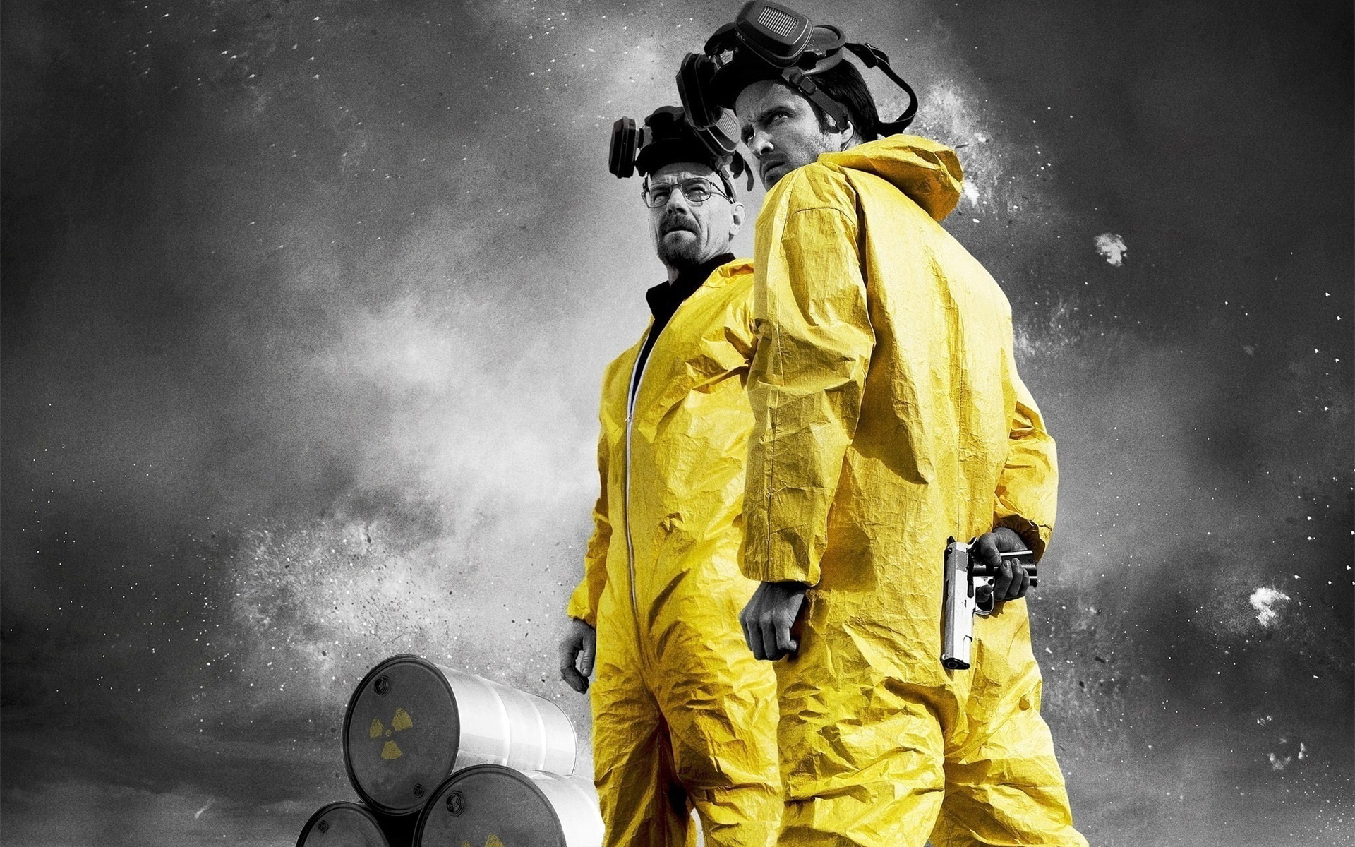 Description: Two men in yellow suits and gas masks walking in front of a barrel of oil with smoke behind them.