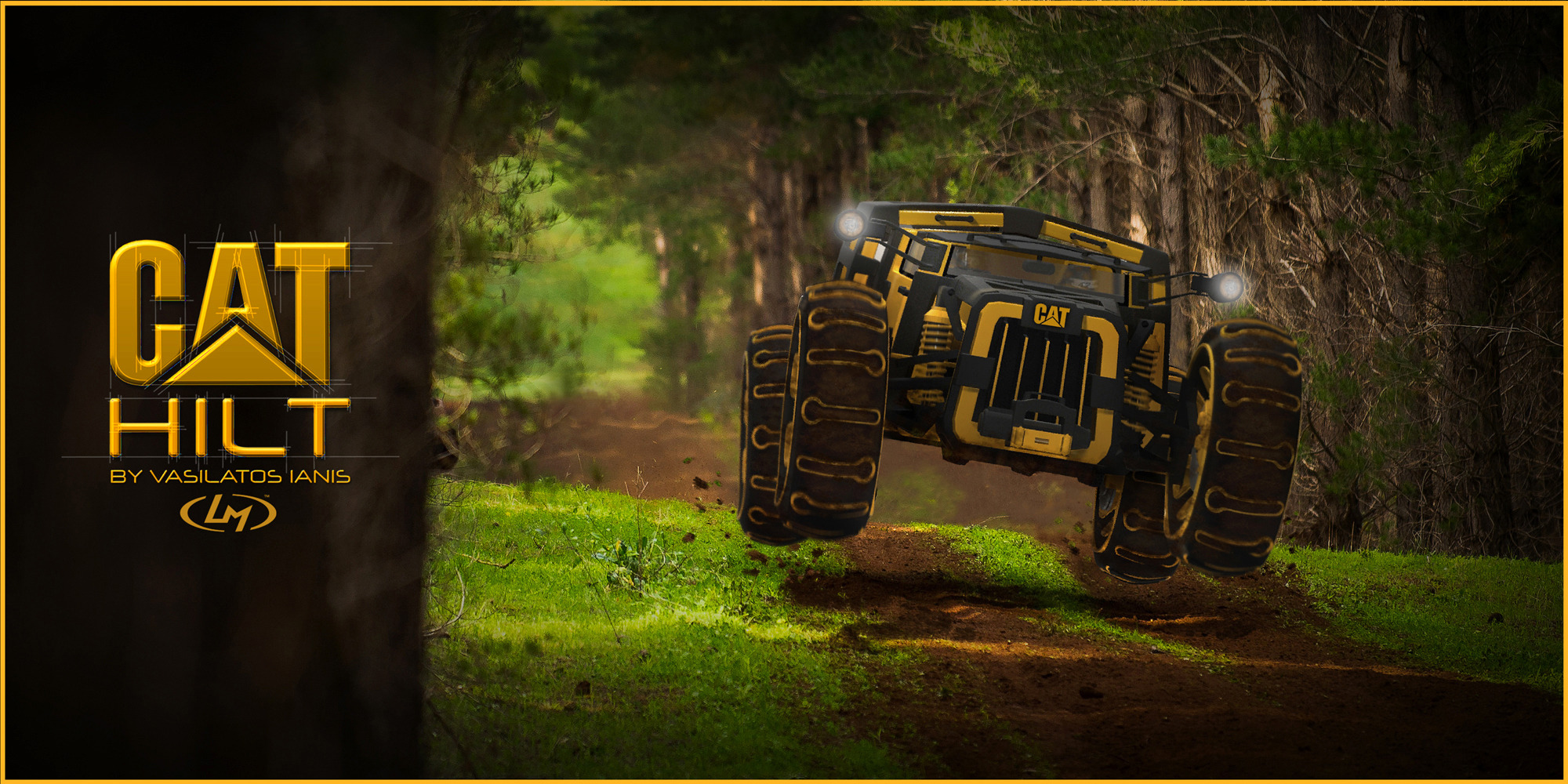 Description: A yellow truck is going through the woods on a trail with trees in the background and a yellow frame.