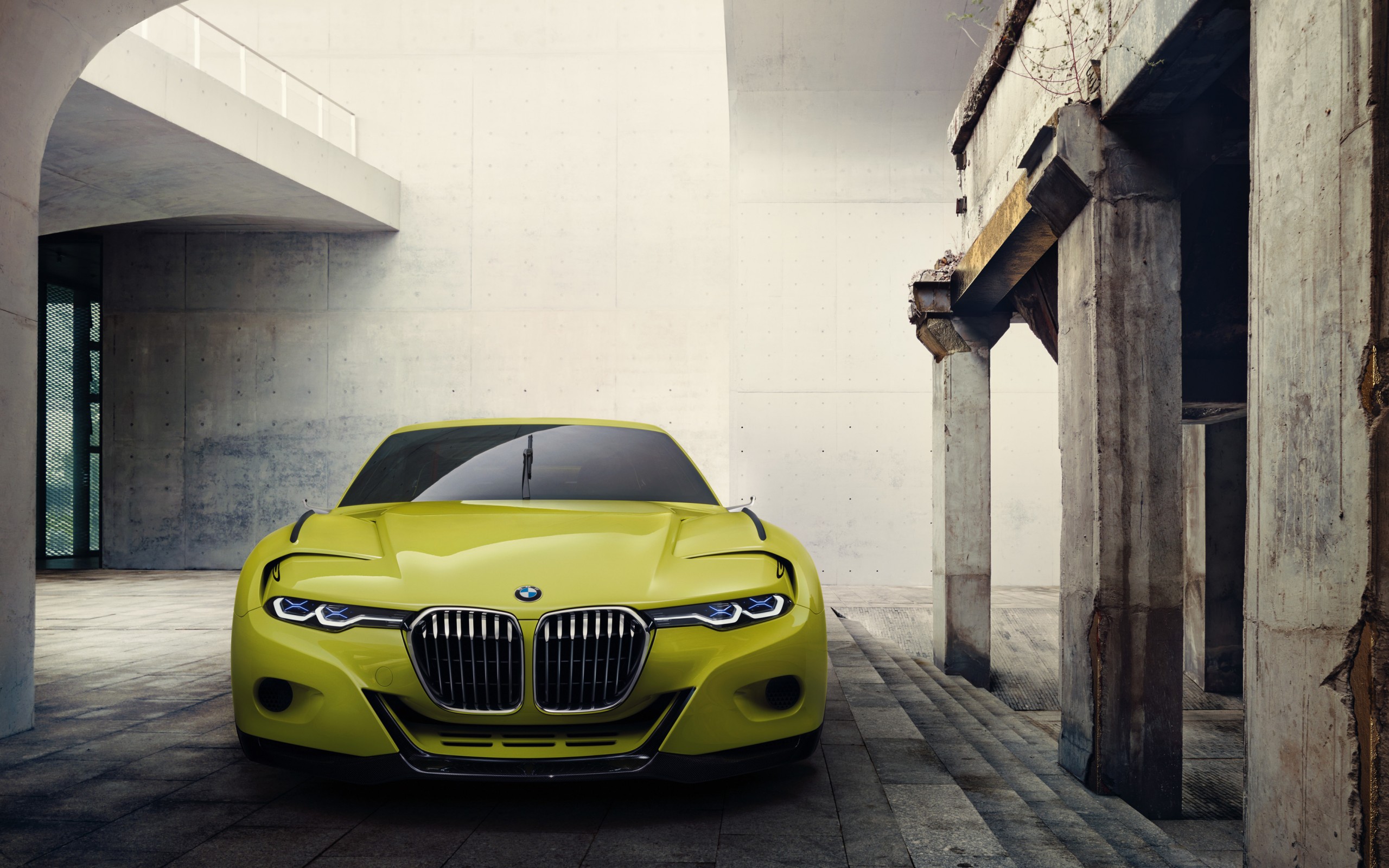 Description: A yellow car parked in a tunnel next to a building with a doorway and a doorway leading to it.