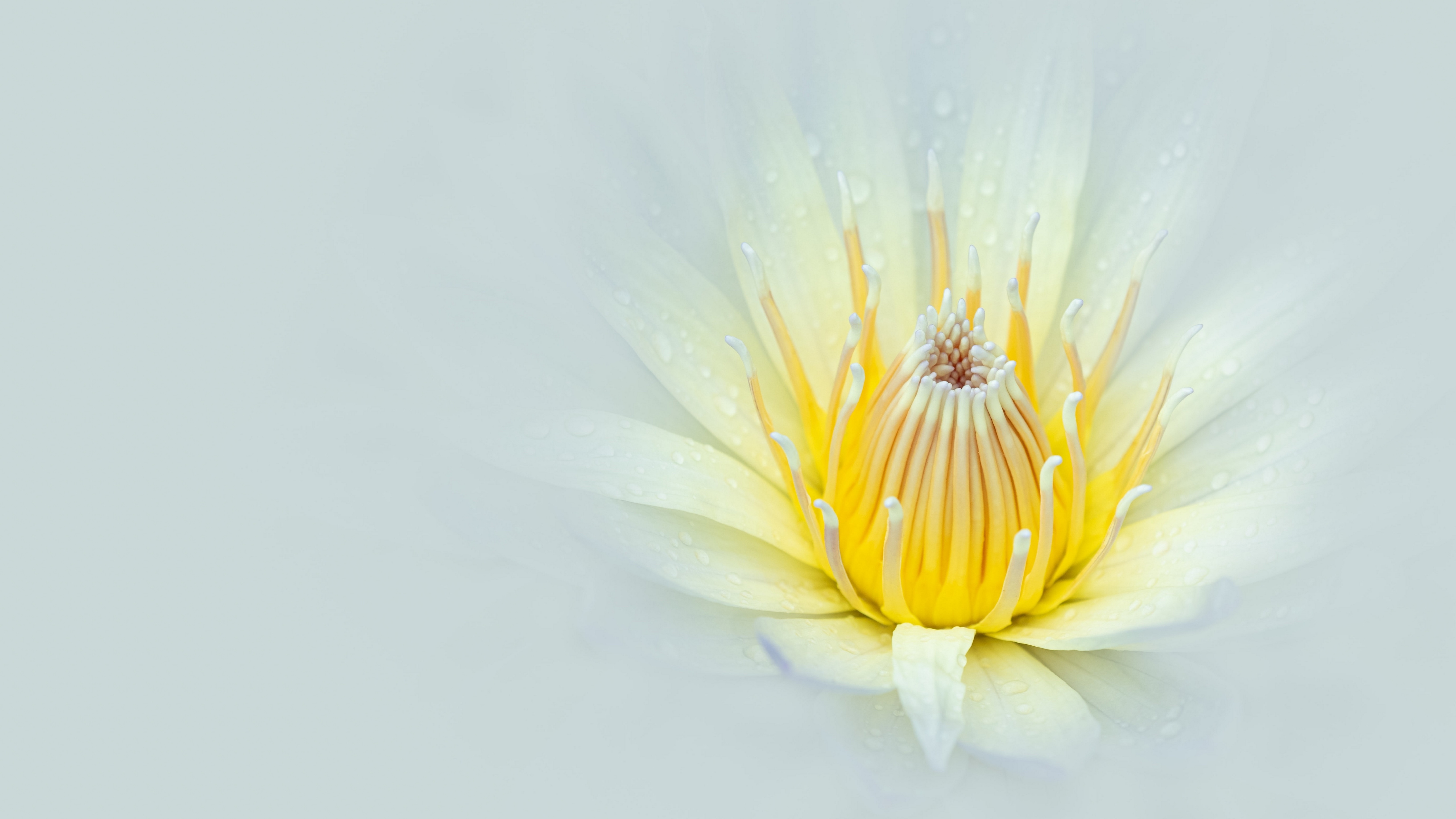Description: A yellow and white flower with water droplets on it's petals and petals are in the center of the flower.