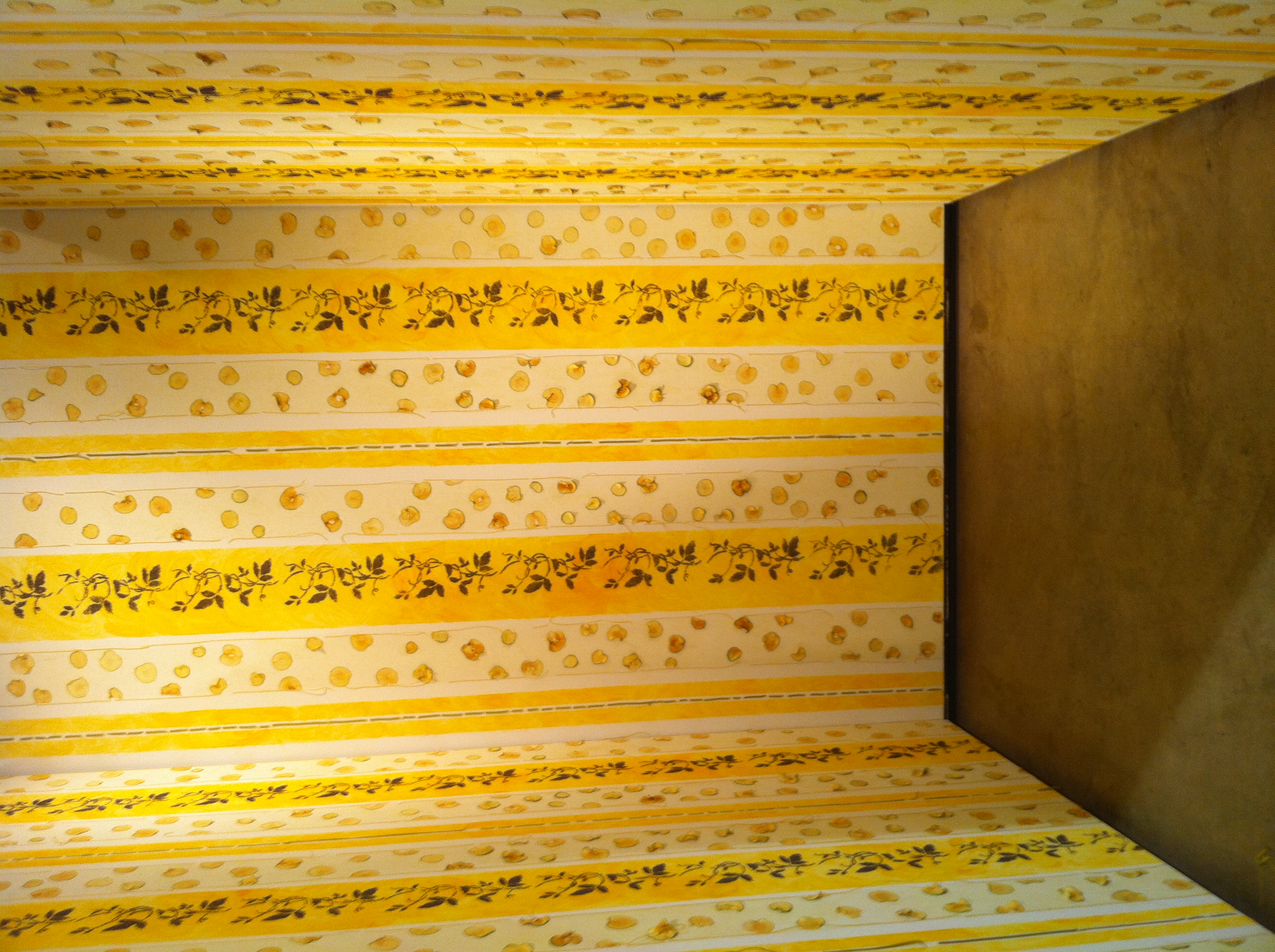 Description: A yellow and white striped wall with a metal door and a yellow and white striped wall with dots and leaves.