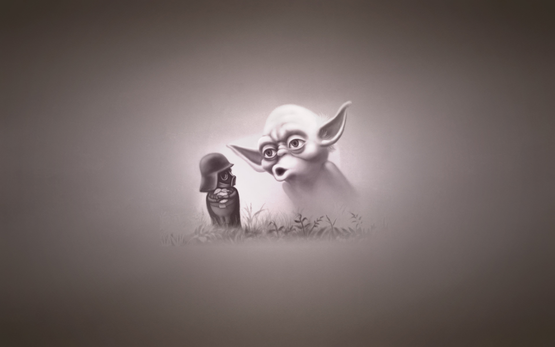 Description: A drawing of a yoda and a darth vader in the fog with a star wars helmet.