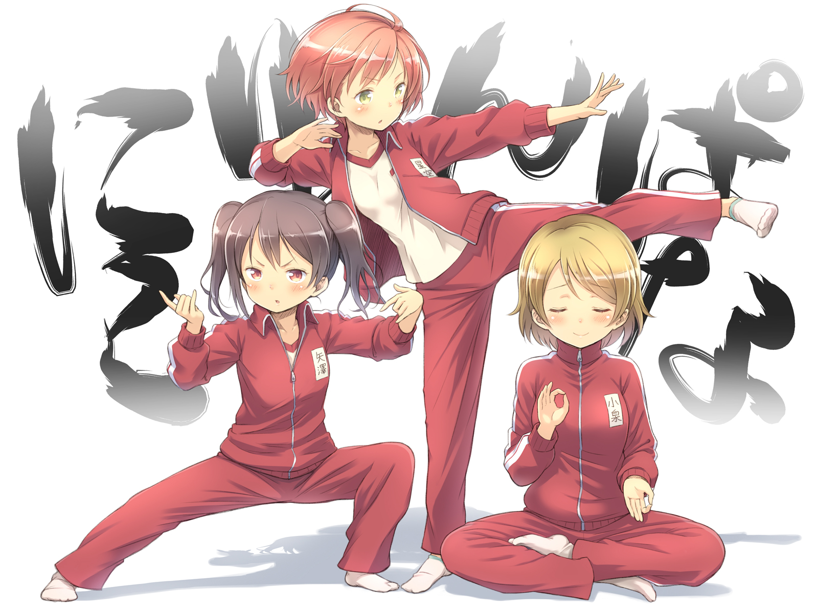 Description: A group of people in red outfits doing yoga poses with their arms up in the air and their legs crossed.