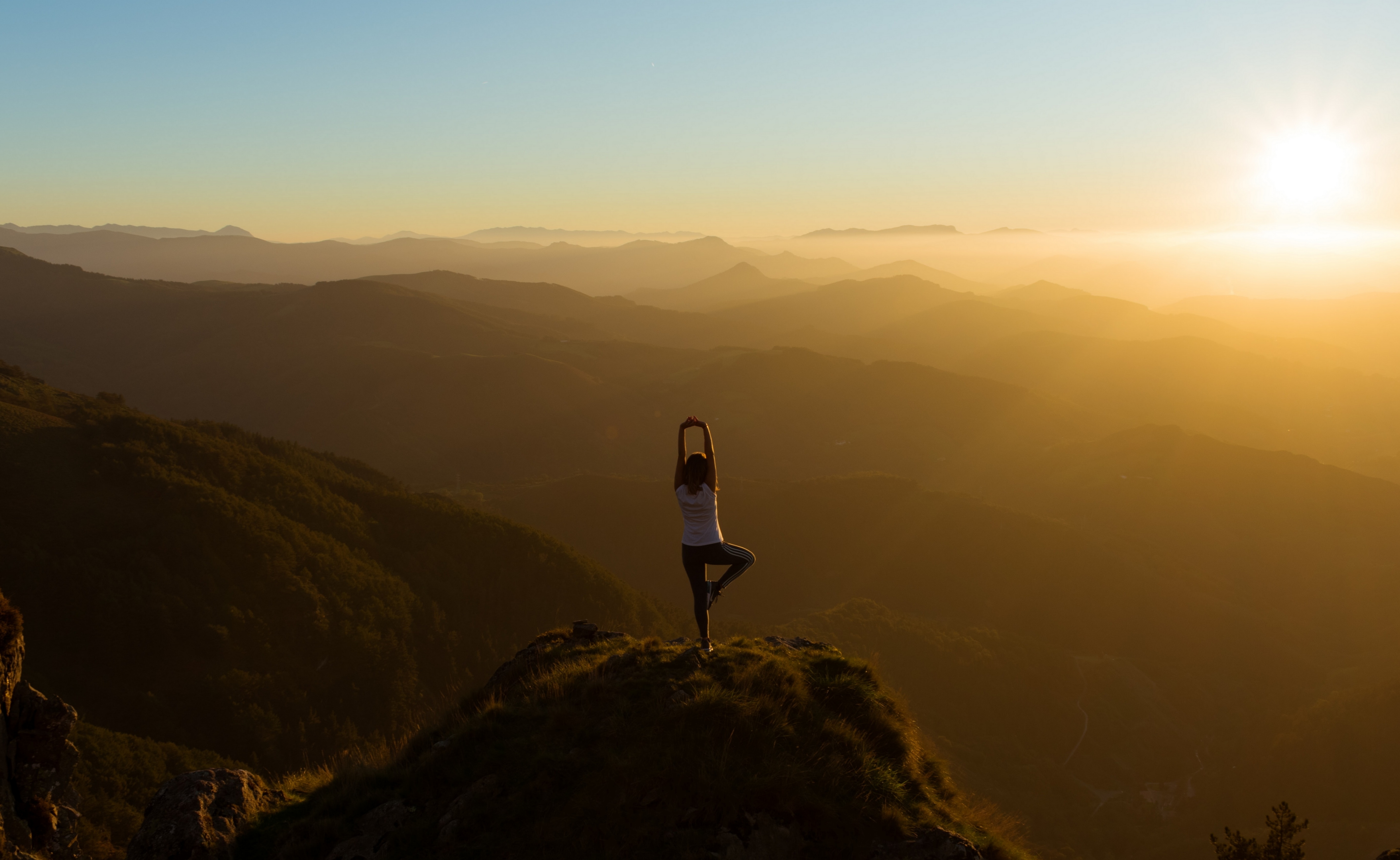 Description: A woman doing yoga on top of a mountain at sunset with her arms in the air and her hands in the air.