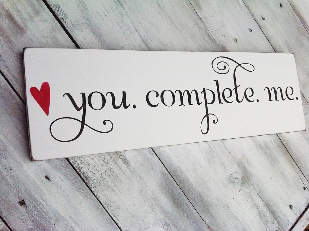Description: A sign that says you complete me on a wooden wall with a heart on it and a handwritten message.
