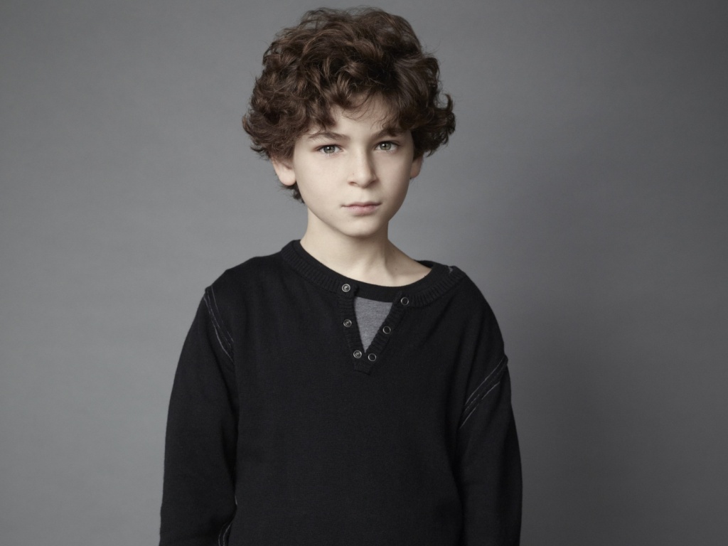 Description: A young boy in a black shirt posing for a picture with a gray background and a gray background behind him.