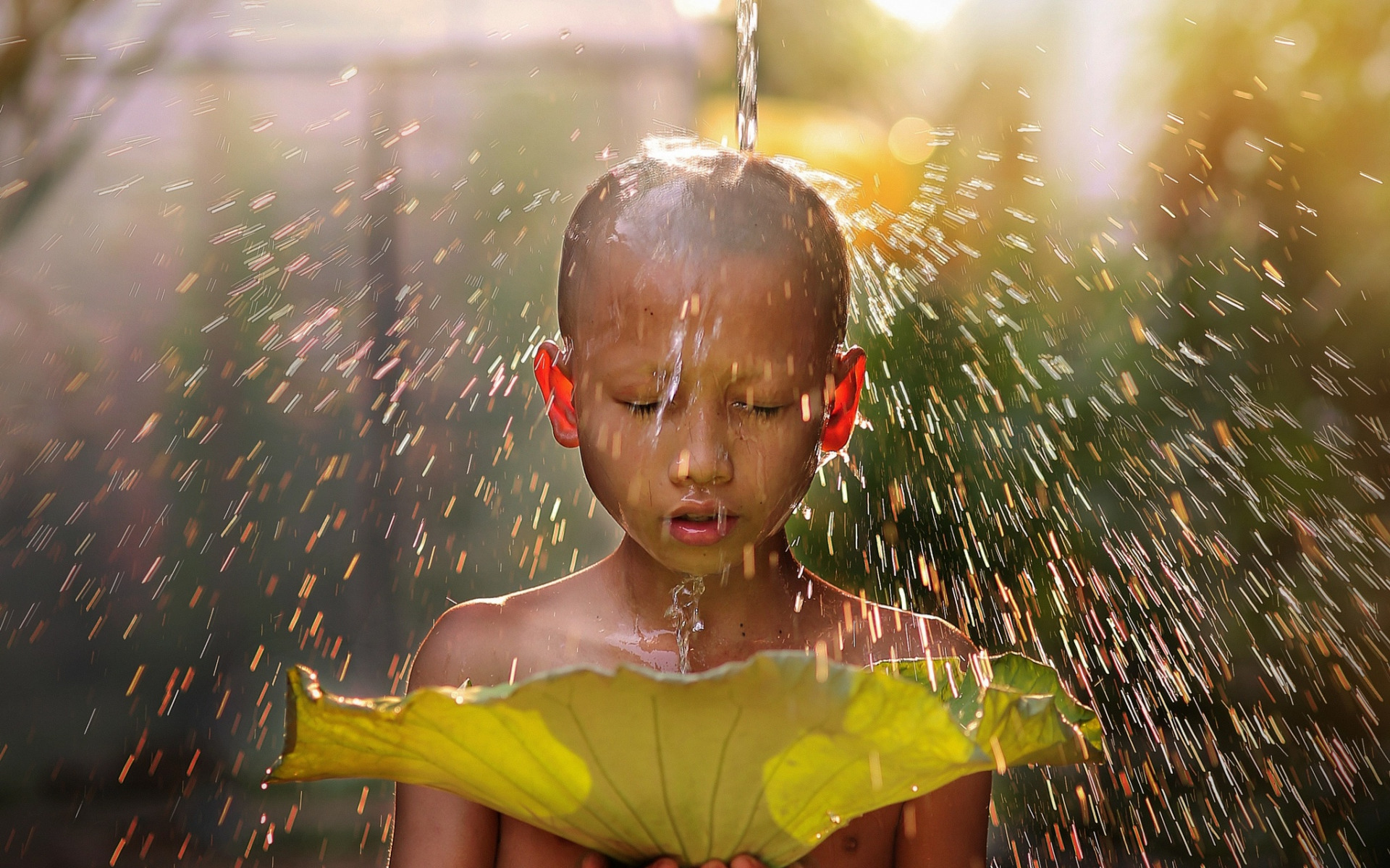 Description: A young boy is sprinkling water on his face with a yellow umbrella in the sun light of the day.