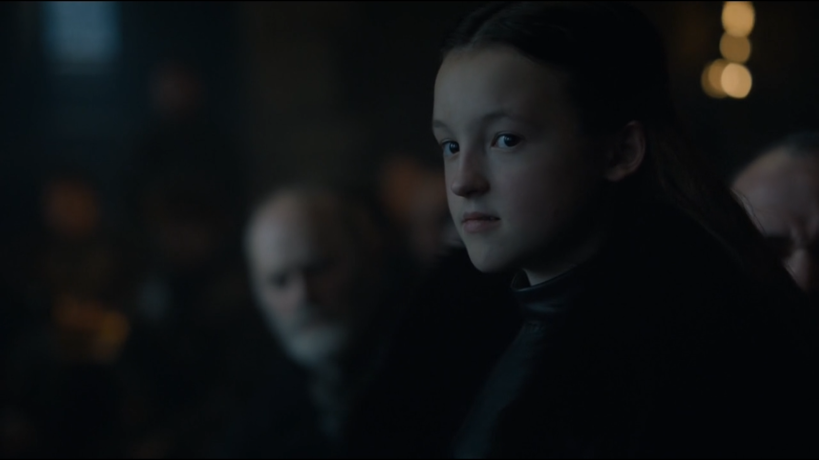 Description: A young girl looks into the distance while others look on in the background in a dark room with lights.