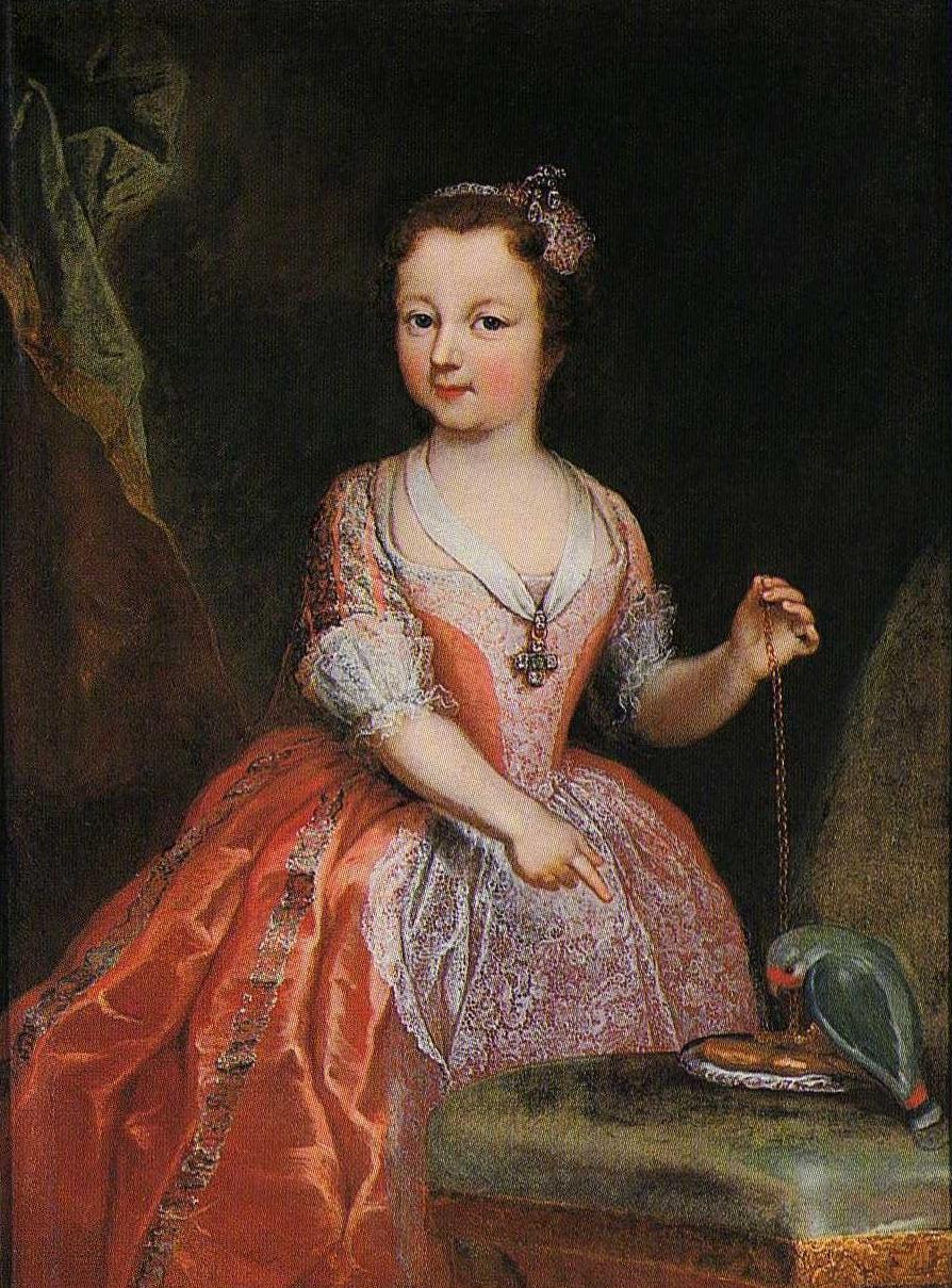 Description: A painting of a young girl in a red dress holding a cane and a hat on a stool with a green hat on top.