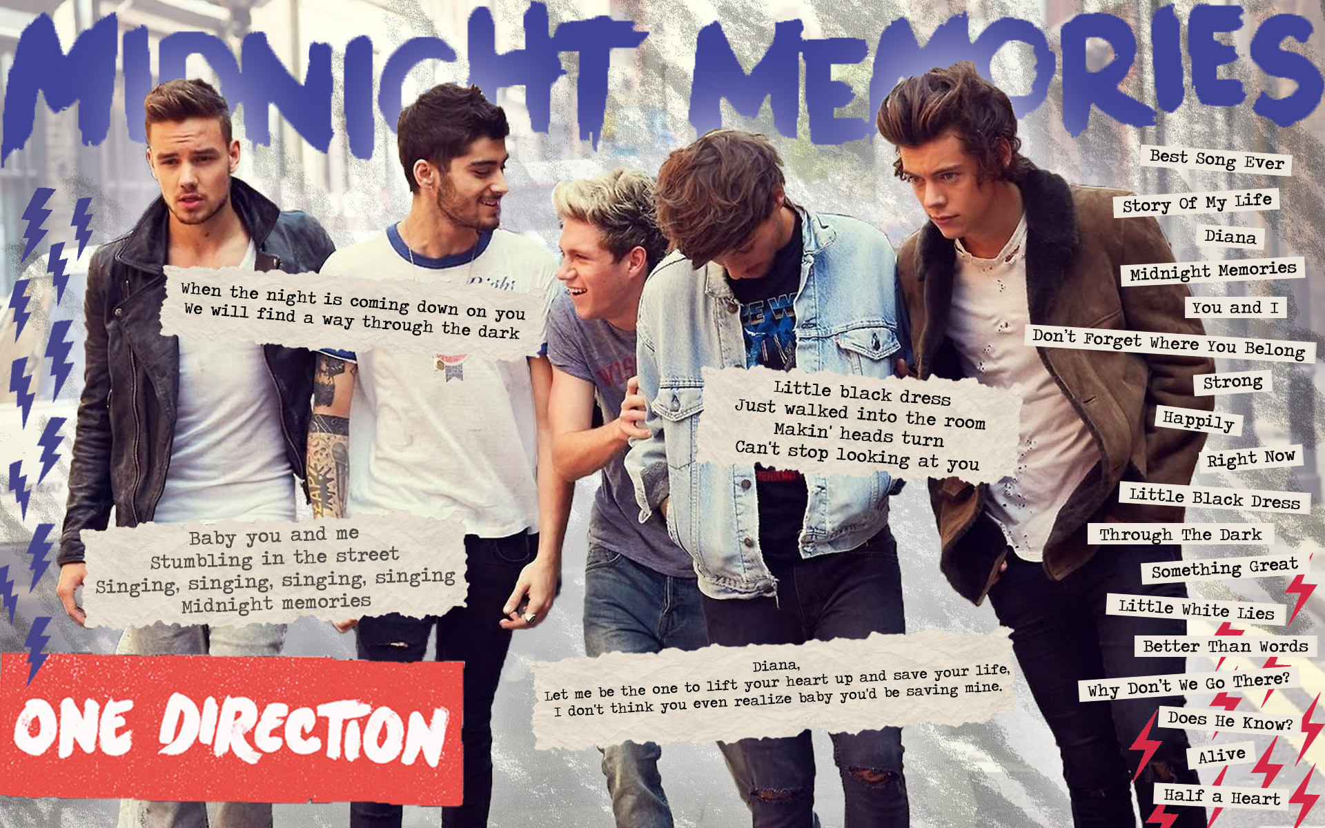 Description: A collage of a group of young men holding paper signs with words written on them and a one direction sign.