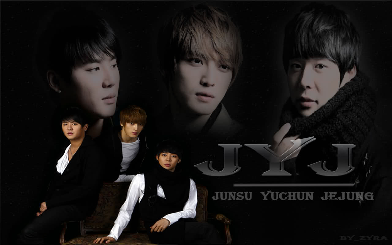 Description: A group of young men sitting next to each other on a couch in front of a black background with the words jyj.