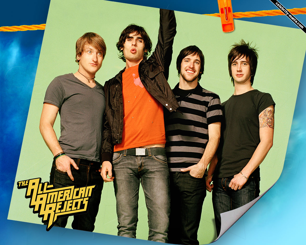 Description: A group of young men standing next to each other in front of a green background with a yellow and black sign.