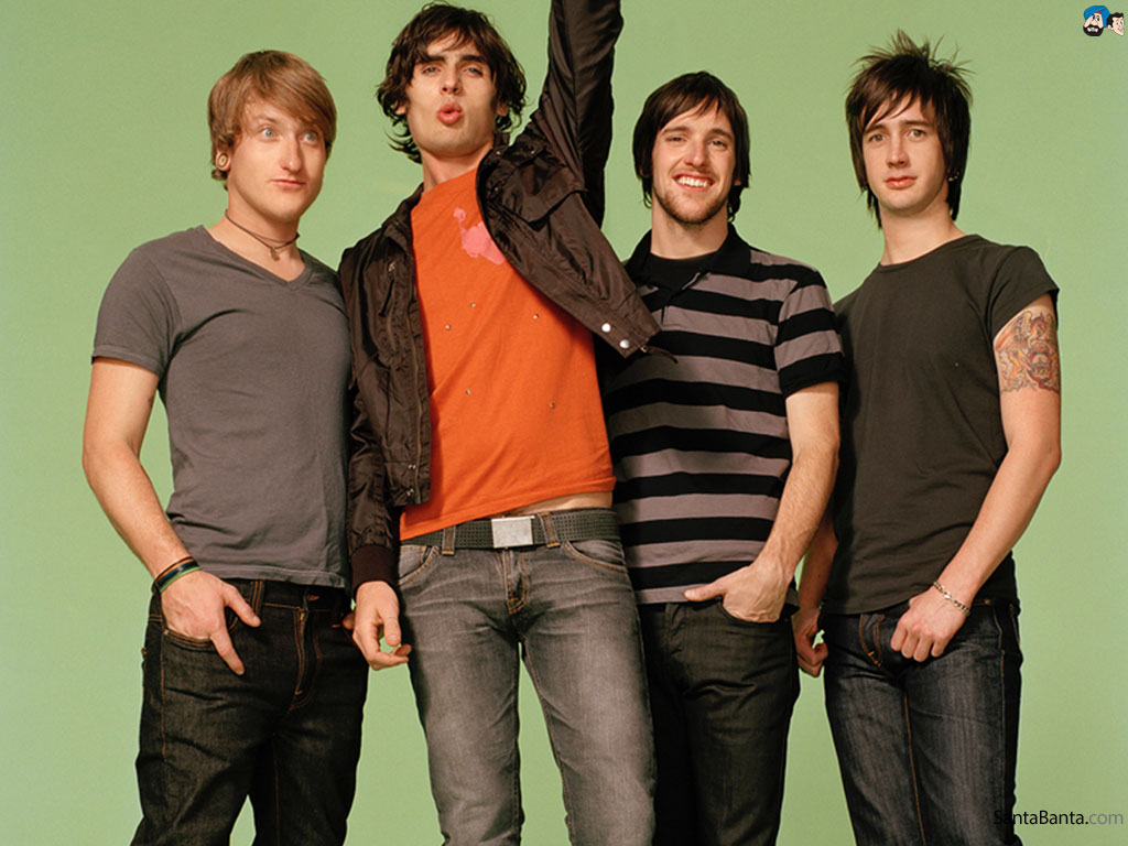 Description: A group of young men standing next to each other holding a skateboard in the air with one hand up.