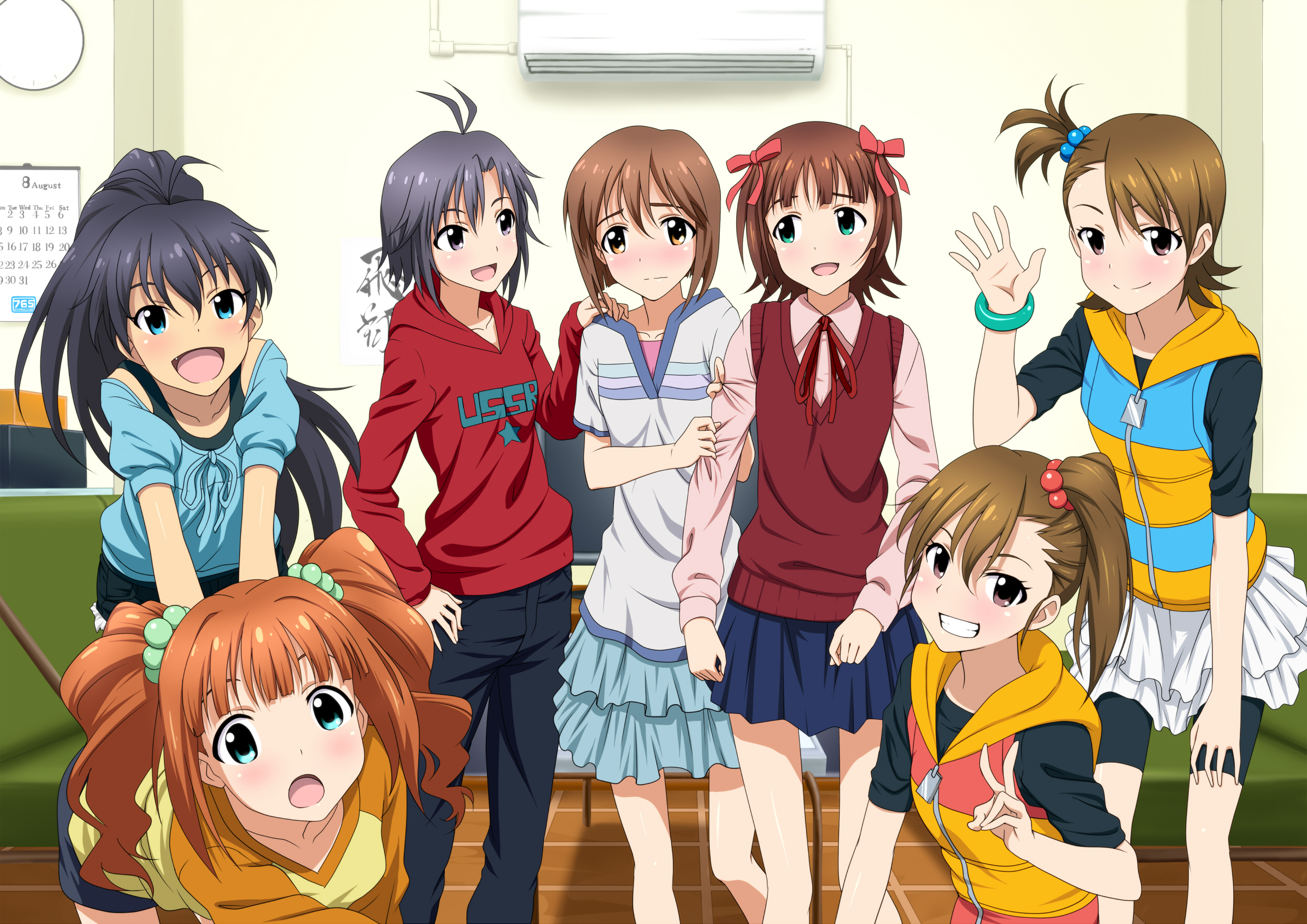 Description: A group of young people standing next to each other in a room with a green couch and a green chair.