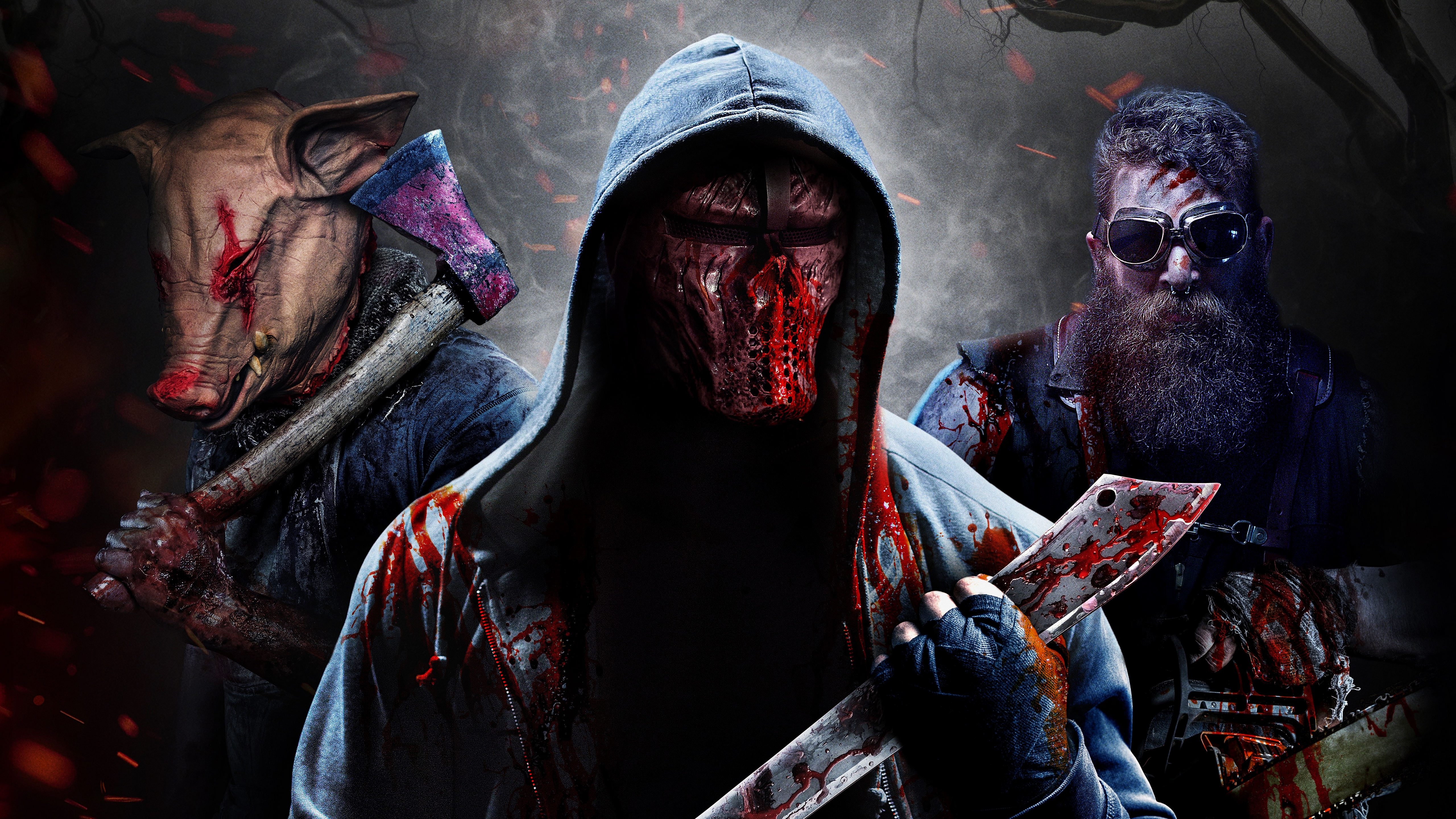 Description: A group of zombies with bloody faces and bloody hands holding knives and knives in their hands.