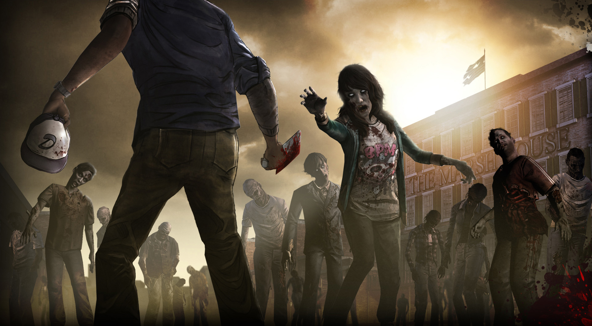 Description: A group of zombies walking through a city street with a man holding a football in his hand and a woman holding a football.
