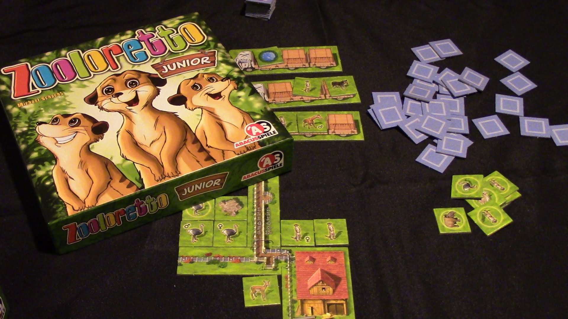 Description: A game of zootop junior with a box and pieces of the game on a table with a black cloth.